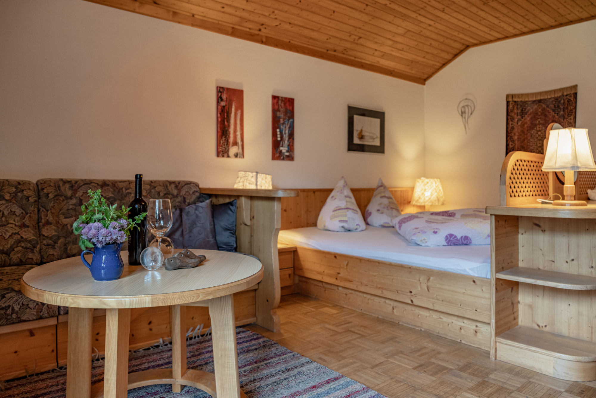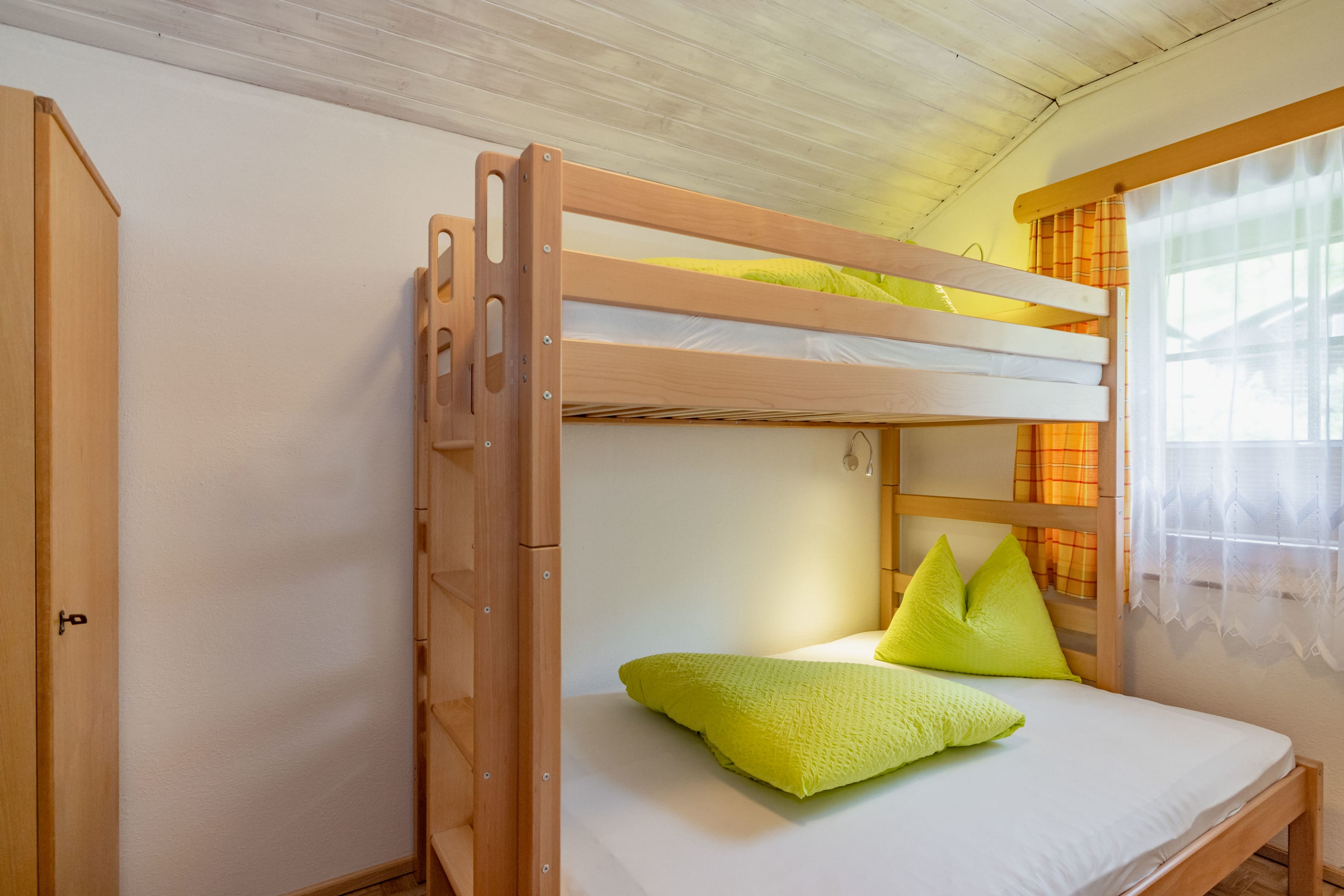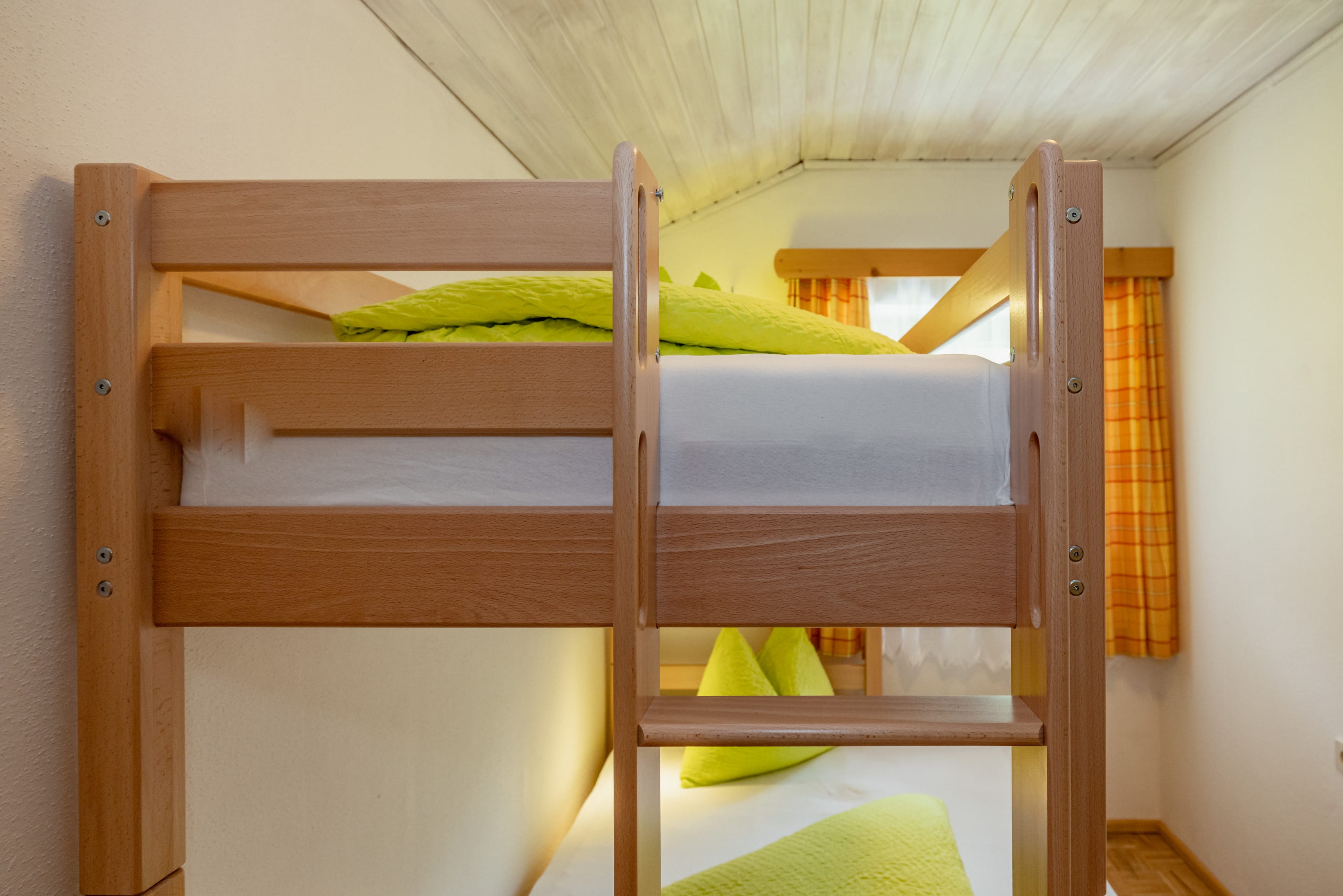 The 45 m² “Fichte” apartment is located on the 2nd floor and offers a balcony with mountain views. Designed with cozy spruce wood interiors, it creates a warm alpine atmosphere. Suitable for 2 to 5 guests, the apartment includes two bedrooms – one of them a children’s room with a bunk bed – as well as a bathroom with shower and toilet and a fully equipped kitchen.
